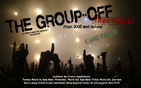 The Group Off is a television-style talent show with hosts and a panel of judges aimed at groups! Auditions are March 1-4.