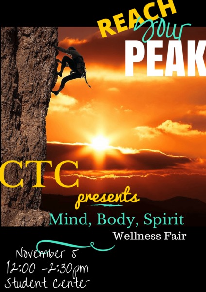 Come join us at the Campus Center as we have our fall 2015 "Mind, Body, Spirit" Wellness Fair with various on-campus and off-campus resources to help you "Reach your Peak."