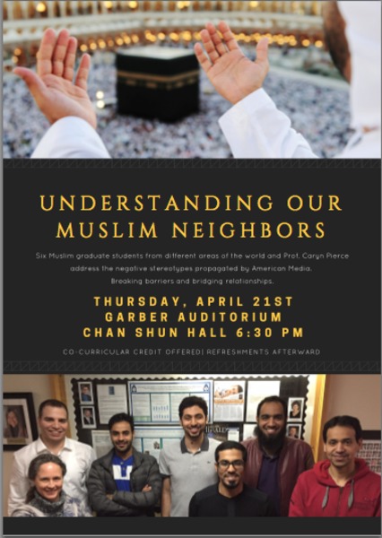 Six Muslim graduate students from the Physical Therapy department will be completing their community leadership projects by addressing the negative stereotypes propagated by American Media, with the intent to break down barriers and bridge relationships. Co-curricular credit will be offered, and the families of the students will be providing middle-eastern refreshments and desserts.