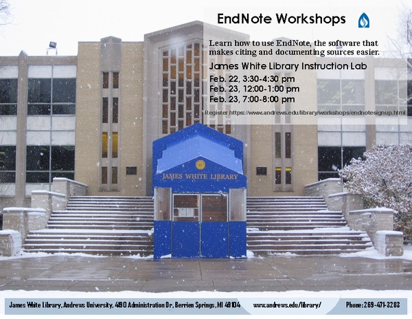 Learn how to use EndNote, the software that makes citing and documenting sources easier. James White Library Instruction Lab, Feb. 22, 3:30-4:30 pm; Feb. 23, 12:00-1:00 pm; and Feb. 23, 7:00-8:00 pm. Register at https://www.andrews.edu/library/workshops/endnotesignup.html. For more information, call 471-6062.