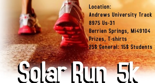 The 5k fun run is being  held on the campus of Andrews University on Sunday April 2 at 9:00 AM. The route is mostly flat, starting out at the campus track, meandering around the campus loop drive, going around the Garland Apartments, and then looping back to the track for the finish. This event features chip timing courtesy of the Andrews University Alumni services. Come get your Solar Run 5k tee shirt and get some great exercise, all the while helping those in need abroad!