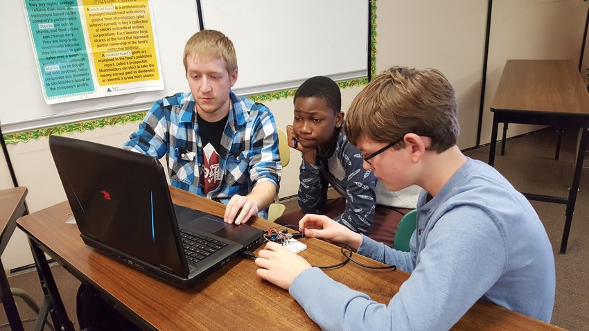 University engineering and computer science students mentor 7th and 8th graders at RMES in computer programming in a University outreach called codeShack.