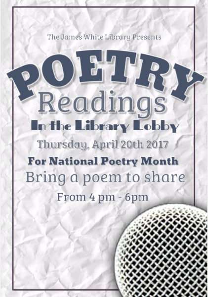 Celebrate National Poetry Month at James White Library Thursday, April 20, 4-6 pm. Bring a favorite poem you have read or written to share. Library Lobby.