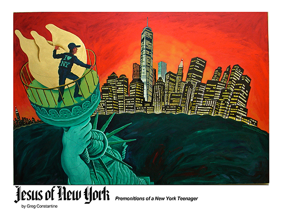 Greg Constantine exhibition of 14 drawings and the cover painting from his book “Jesus of New York” subtitled “Premonitions of a New York Teenager.” The book’s 50 drawings and the paraphrases of Gospel texts were created for his students so they could better identify with a 19 year-old Jesus in the present day New York City. The exhibit opening reception for the public will be on Wednesday, September 6 from 6 to 8 pm in The ART Gallery located in Harrigan Hall (top floor). The dates for the exhibit are Sept 6 to 28.