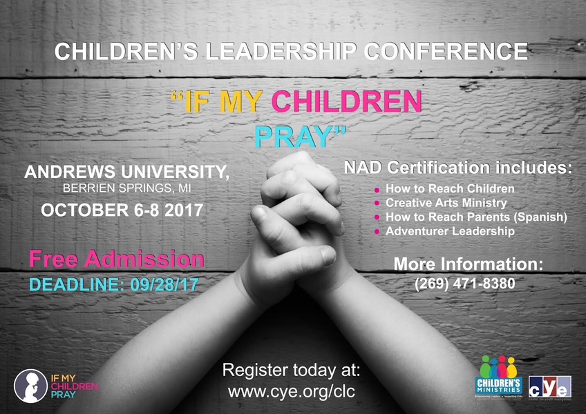 The Center for Youth Evangelism will host its annual Children's Leadership Conference on October 6–8 on the campus of Andrews University under the theme "If My Children Pray." We are pleased to announce that this year the conference is offering FREE admission because of the generosity of our sponsors: the North American Division, Lake Union Conference and Center for Youth Evangelism. This is the perfect opportunity for children's ministry leaders, Sabbath School teachers, pastors and all those who are passionate about prayer and ministering to God's precious jewels. We have a great team of motivational presenters who will empower and inspire you to incorporate innovative tools to reach God's children including Sherri Uhrig (NAD Children's Ministry Director), Handy Andy and many more. The North American Division is offering FREE certification in the following tracks: