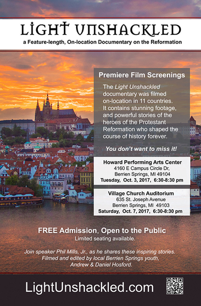 The premiere film screenings of Light Unshackled," a feature-length, on-location documentary on the Protestant Reformation, will be held twice in Berrien Springs. Light Unshackled contains stunning footage and powerful stories of the heroes of the Protestant Reformation who shaped the course of history forever.