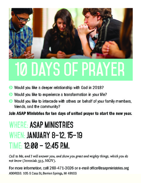 Join ASAP Ministries for ten days of united prayer to start the new year. Seek a deeper walk with God, pray the Word for the needs of the persecuted, poor, unreached and refugees from the 10/40 window, and intercede on behalf of friends, family members and our local community. We will meet January 8–12 and 15–19 from 12–12:45 p.m. at ASAP Ministries, 105 S. Cass St., Berrien Springs, MI 49103. Call 269-471-3026 or email office@asapministries.org for more information.