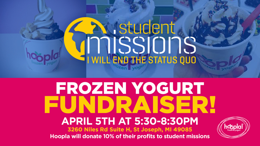 Head over to Hoopla Frozen Yogurt in St. Joseph (near Panera), and from 5:30-8:30 p.m. on April 5 they will donate 10 percent of their profits to the Andrews Student Missions program!