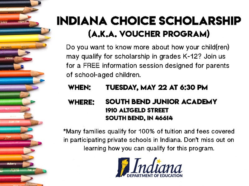 Tuesday, May 22, at 6:30 p.m. at South Bend Junior Academy: 1910 Altgeld Street, South Bend, IN 46614.