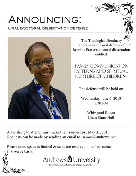 The Seventh-day Adventist Theological Seminary announces the oral defense of Jasmine Fraser's doctoral dissertation entitled "Family Communication Patterns and Spiritual Nurture of Children."
