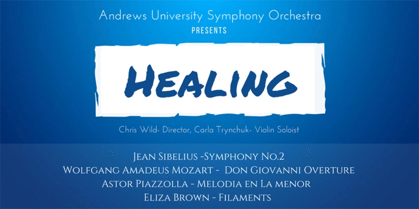 The Andrews University Symphony Orchestra, under the direction of Chris Wild, will be presenting their fall concert entitled "Healing" on October 27, 2018, at 8 p.m. Carla Trynchuk will be playing with them as their guest violin soloist. The repertoire will include selections from Jean Sibelius, Wolfgang Amadeus Mozart, Astor Piazzolla and Eliza Brown.