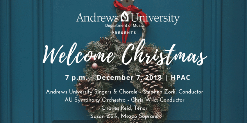 2018 "Welcome Christmas" presents the annual choral Christmas concert conducted by Stephen Zork, entitled "When You Come"—a garland of Christmas carols proclaiming and reliving the advent and gospel of Jesus Christ as portrayed through scripture and oral traditions throughout the ages. The collaborative concert will feature Andrews University Department of Music ensembles: Singers, Chorale, Symphony Orchestra and tenor Charles Reid, associate professor of voice and artist-in-residence at Andrews University. The Andrews University Symphony Orchestra is conducted by Chris Wild.
