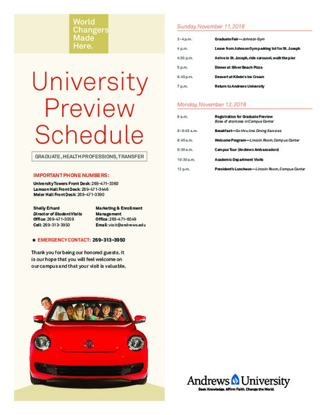 Come and be a part of our first Graduate Preview and Health Profession programs. We are also welcoming any transfer students who would like to visit at this time! Andrews has a rich selection of graduate programs to choose from. Come and see the possibilities.