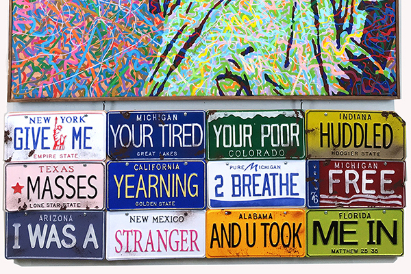 Written out in a collection of license plates at the base of the painting is the statement, “Give me your tired, your poor huddled masses yearning 2 breathe free. I was a stranger and u took me in.” Constantine hand-crafted the license plates from vacuum-formed plastic, then meticulously painted and distressed the plates, applying actual rust.