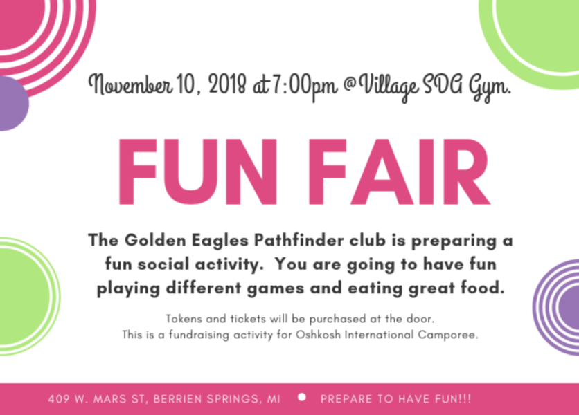 The Golden Eagles Pathfinder club is preparing a social activity for November 10 at 7 p.m. at the Village School Gym. You are going to have fun playing different games and eating great food.