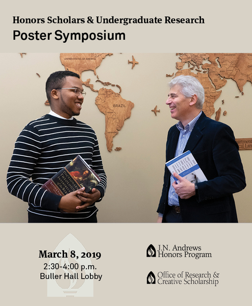 On Friday, March 8, 2019, please plan on joining the Honors Family to celebrate the research investigations of our thesis students. From 2:30–4 p.m. in Buller Hall, Honors and the Office of Research and Creative Scholarship will be hosting our annual poster session. Please drop by the Buller Hall lobby to support and learn from our Honors Thesis researchers as well as from our colleagues who have completed Undergraduate Research Scholarships. Delicious savory and sweet snacks will be served, and Honors service credit can be earned for attendance.
