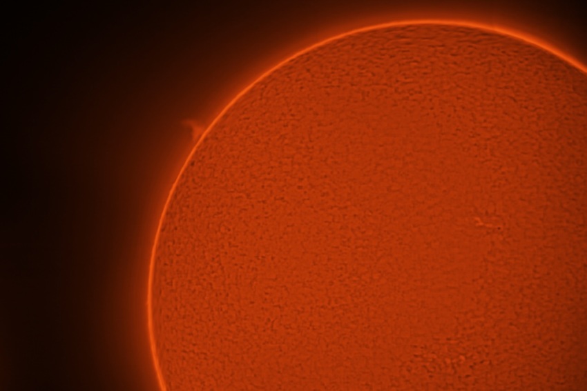 This image of a solar prominence was taken at the Kingman Observatory on March 8, 2019. Carson O'Ffill, junior chemical engineering major, used an 8" reflector telescope with a light-limiting red filter to highlight the Sun's chromosphere. A solar prominence is material ejected from the Sun's surface and is roughly the size of the Earth. The textured appearance of the Sun's surface is due to hot rising gases.