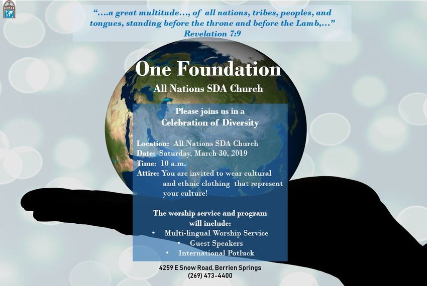 You are cordially invited to join the All Nations Church on Saturday March 30, 2019, at 10 a.m., in a celebration of diversity to reflect Revelation 7:9, “….a great multitude…, of all nations, tribes, peoples, and tongues, standing before the throne and before the Lamb,…” Our theme for this year is “One Foundation.”
