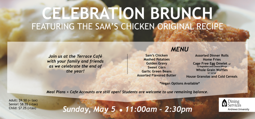 Please join us on Sunday, May 5, from 11 a.m.–2:30 p.m. for a special Graduation Brunch featuring Sam's Chicken and other classic favorites! Students are welcome to use any remaining balance they may have on their meal plan or cafe account.