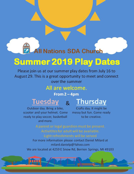 All Nations’ Children’s Ministry presents 2019 Summer Play Dates from July 16 to August 29 every Tuesday and Thursday from 2–4 p.m. Please join us as we bike ride, play basketball, do arts & crafts and more! A parent or legal guardian must be present. There will be Activities for adults and children and light refreshments will be served! For more information, please contact Daniel Milard at milard.danielp@yahoo.com.