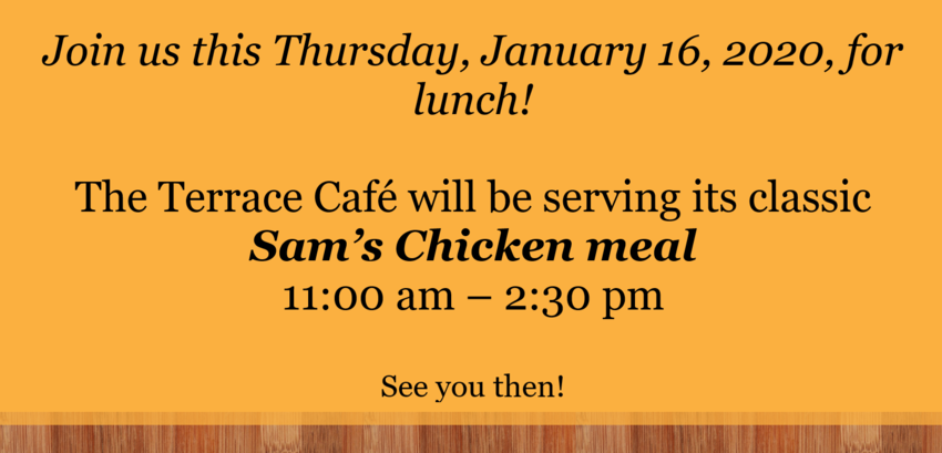 The Terrace Café will be serving its classic Sam’s Chicken meal from 11 a.m.–2:30 p.m.