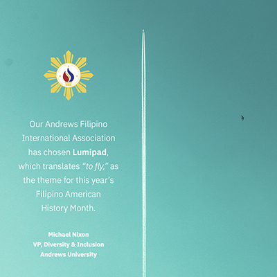 This year, the FANHS has chosen the theme “Filipino Americans: Making History for 425 Years” for this October’s Filipino American History Month commemorations across the nation. Our Andrews Filipino International Association (AFIA) has chosen “Lumipad” which translates “to fly” as our campus theme for the month. We are grateful for their leadership in putting together celebratory events for this month.