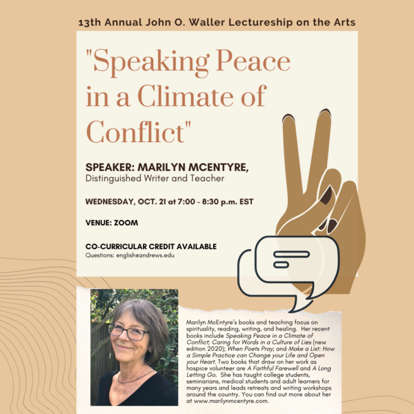 The Andrews University Department of English invites you to attend this year’s John O. Waller Lectureship in the Arts. Distinguished author and professor Marilyn McEntyre’s timely topic is “Speaking Peace in a Climate of Conflict.” This year the lectureship will take place in webinar format on Zoom. The speaker’s talk will be followed by an interview and opportunity for questions and answers.