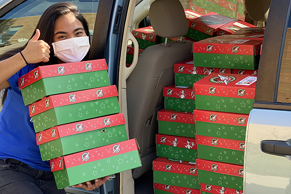 Hope Malabrigo, student chaplain, loads dozens of filled boxes for Operation Christmas Child.