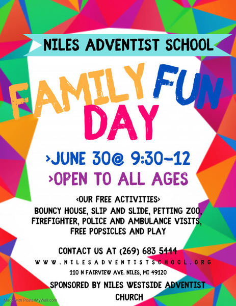 All ages are invited to join us for free activities such as a bouncy house; slip & slide; petting zoo; firefighter, police & ambulance visits; and free popsicles. For more information, call 269-683-5444 or visit nilesadventistschool.org.