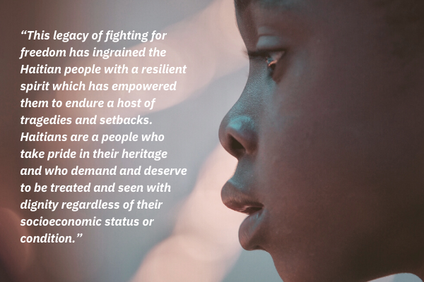 This legacy of fighting for freedom has ingrained the Haitian people with a resilient spirit which has empowered them to endure a host of tragedies and setbacks. Haitians are a people who take pride in their heritage and who demand and deserve to be treated and seen with dignity regardless of their socioeconomic status or condition.