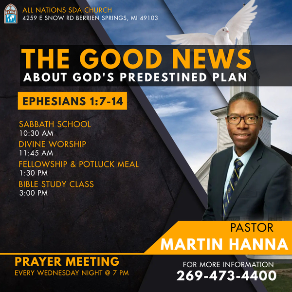 All Nations invites you to its 11:45 a.m. worship experience on Sabbath, July 30. This Sabbath's sermon will be delivered by Pastor Martin Hanna and is titled  "The Good News About God's Predestined Plan."