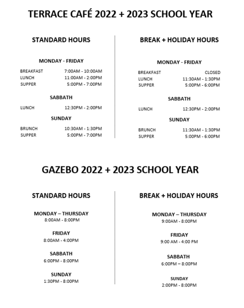 Please note the Terrace Café and Gazebo hours for the 2022–2023 school year.