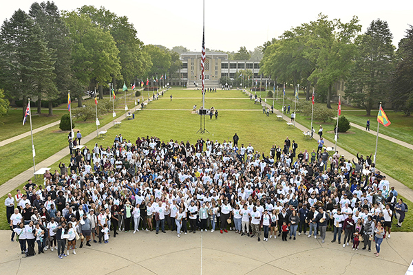Students gather at the flag mall before departing for their volunteer sites.