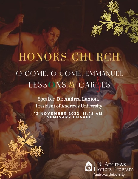 Join the Honors Program faculty and students in a service of spoken word and carols to welcome the Christmas season. Andrea Luxton, president, Andrews University, will deliver the homily. All members of the community are most welcome.