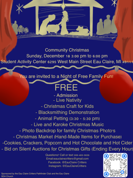 Sponsored by the Eau Claire Critters Pathfinder Club and the Eau Claire SDA Church. Questions? Call or text 269-405-5026, email Eauclairecritters@gmail.com, or visit Facebook (@EauClaireCritters) or Instagram (@EauClaireCritters).