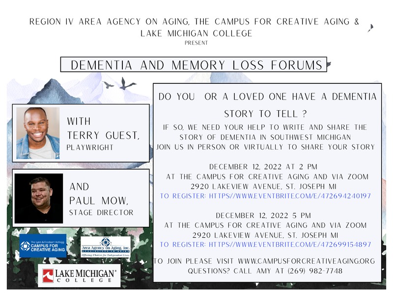 As a part of Dementia Friendly Community work, the Campus for Creative Aging and Region IV Area Agency on Aging are stepping into a new Arts & Aging Partnership and will be working with a playwright to create a piece based on local community members' thoughts, feelings and experiences about living with dementia and memory loss. To ensure a diverse and full community voice is captured in the creative process, the Campus is hosting Dementia and Memory Loss Forums in the upcoming week. You may join in person or via Zoom.