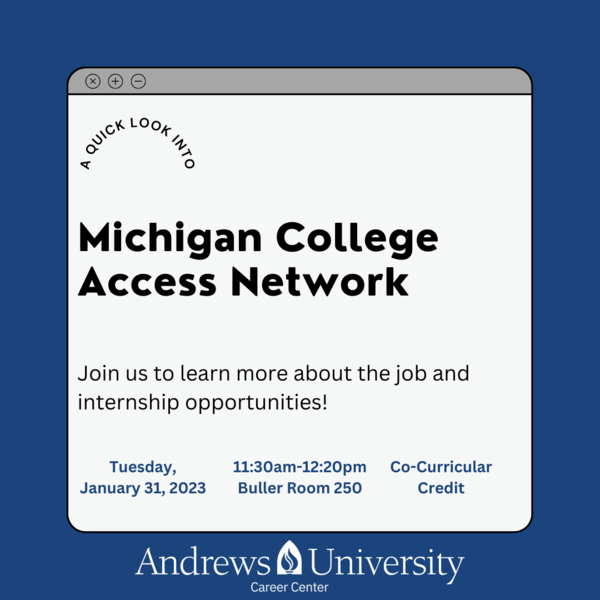 The Michigan College Access Network (MCAN), which seeks to help more Michigan students pursue and succeed in postsecondary education will be on campus to talk about their available positions for soon-to-be graduates and recent grads. These positions are a great step for recent grads seeking their first professional experience, for someone doing a gap year between undergrad and grad school, and for anyone looking to have a meaningful experience where they can make a difference while gaining their own professional skills. This session takes place on Tuesday, Jan. 31, 2022, during the co-curricular period (11:30 a.m.–12:20 p.m.) in Buller Hall, Room 250. This session is recommended for all majors. A hybrid option is available for distance learning students only. For more information, and for a hybrid option for distance learning students, contact the Career Center at career@andrews.edu or 269-471-6288.