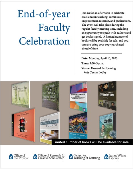 Join us for an afternoon to celebrate excellence in teaching, continuous improvement, research and publications. The event will take place during the regular faculty meeting time, and it will include an opportunity to speak with authors and get books signed. A limited number of books will be available for sale, and you can also bring your own copy purchased ahead of time.