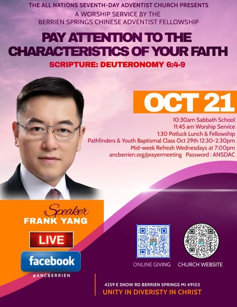 Join the All Nations SDA Church this Sabbath, Oct. 21, at 11:45 a.m. as the Berrien Springs Chinese Adventist Fellowship worships with us. Frank Yang will present "Pay Attention to the Characteristics of Your Faith." Adult and children's Sabbath School begins at 10:30 a.m. There is potluck directly after service. All are welcome!