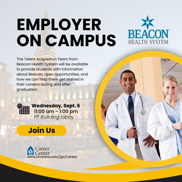 The Talent Acquisition Team from Beacon Health System will be on campus in the PT building from 11 am - 1 pm on Wednesday, September 6 to provide students with information about Beacon, open opportunities, and how they can help students get started in their careers during and after graduation.