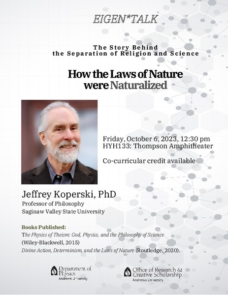On Friday, Oct. 6, 2023, at 12:30 p.m. in the HYH133 Thompson Amphitheater, Jeffrey Koperski, PhD, professor of philosophy at Saginaw Valley State University, will present on the topic "The Story Behind the Separation of Religion and Science: How the Laws of Nature were Naturalized." Cocurricular credit is available.