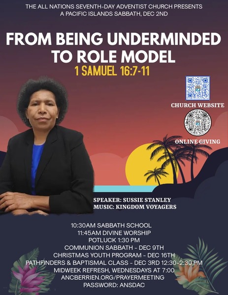 Join us for Pacific Islander Sabbath, this Saturday, December 2, at 11:45 a.m., as Sussie Stanley presents "From Being Underminded to Role Model." Adult and Children's Sabbath School begins at 10:30 a.m. There is potluck following service. All are welcome!