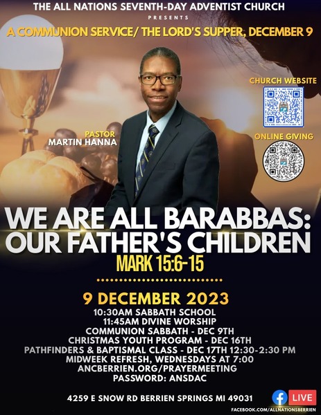 Join us for Communion Sabbath, this Saturday, December 9, at 11:45 a.m., as Martin Hanna presents "We Are All Barabbas: Our Father's Children." Adult and Children's Sabbath School begins at 10:30 a.m. We look forward to seeing you there!