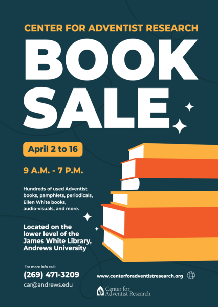 The books are competitively priced and will be less costly than at the various online sources for Adventist used books. We accept cash, checks and credit/debit cards. The sale begins on April 2 and will conclude on April 16. The sale hours will match the Center’s public hours: Monday to Thursday from 9 a.m.–7 p.m. and Friday from 9 a.m.–1 p.m. For more information, you may call the Center at 269-471-3209 or email car@andrews.edu.