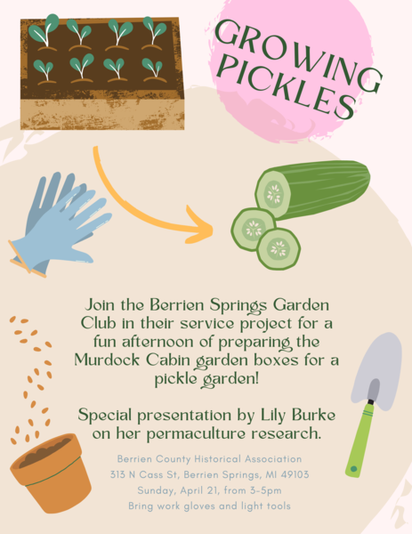 Join the Berrien Springs Garden Club in their service project for a fun afternoon of preparing the Murdock Cabin garden boxes for a pickle garden! There will be a special presentation by Andrews University student Lily Burke on her permaculture research.