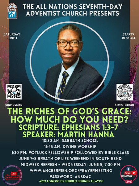 Join us for an uplifting worship experience this Saturday, June 1, at 11:45 am as Martin Hanna presents "The Riches of God's Grace: How Much Do You Need?" Adult and Children's Sabbath School starts at 10:30 am. Lunch is provided. All are welcome!