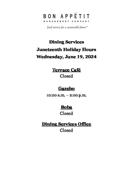 Please note the Dining Services Juneteenth hours (Wednesday, June 19). The Gazebo will be open from 10 a.m.–2 p.m. The Terrace Café, Boba and the office will be closed.