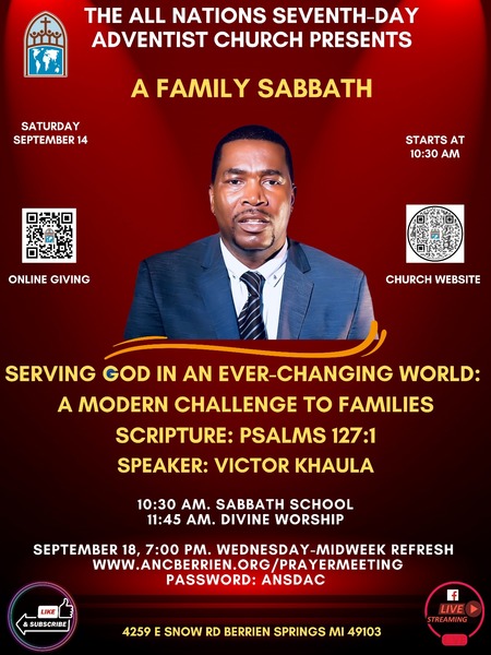 Join the All Nations Seventh-day Adventist Church for a family-focused Sabbath this Saturday, Sept. 14, at 11:45 a.m. as Victor Khaula presents "Serving God in an Ever-Changing World: A Modern Challenge to Families." Sabbath School begins at 10:30 a.m. We look forward to seeing you there!