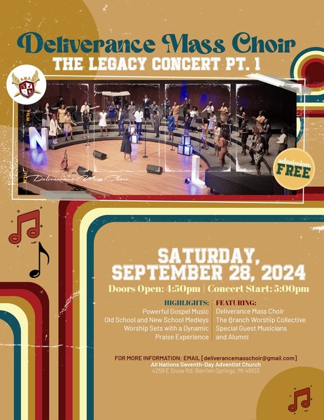 The Deliverance Mass Choir (DMC) will host its Legacy Concert Pt.1 on Sabbath, Sept. 28, at the All Nations Seventh-day Adventist Church, located at 4259 E Snow Rd, Berrien Springs, MI 49103, at 5 p.m. Doors open at 4:50 p.m. and admission is free!