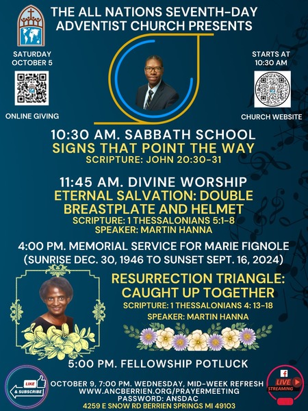 Join us for our worship experience this Saturday, October 5, @ 11:45 am as Martin Hanna presents "Eternal Salavation: Double Breastplate and Helmet." Sabbath School begins @ 10:30 am. We hope to see you there!